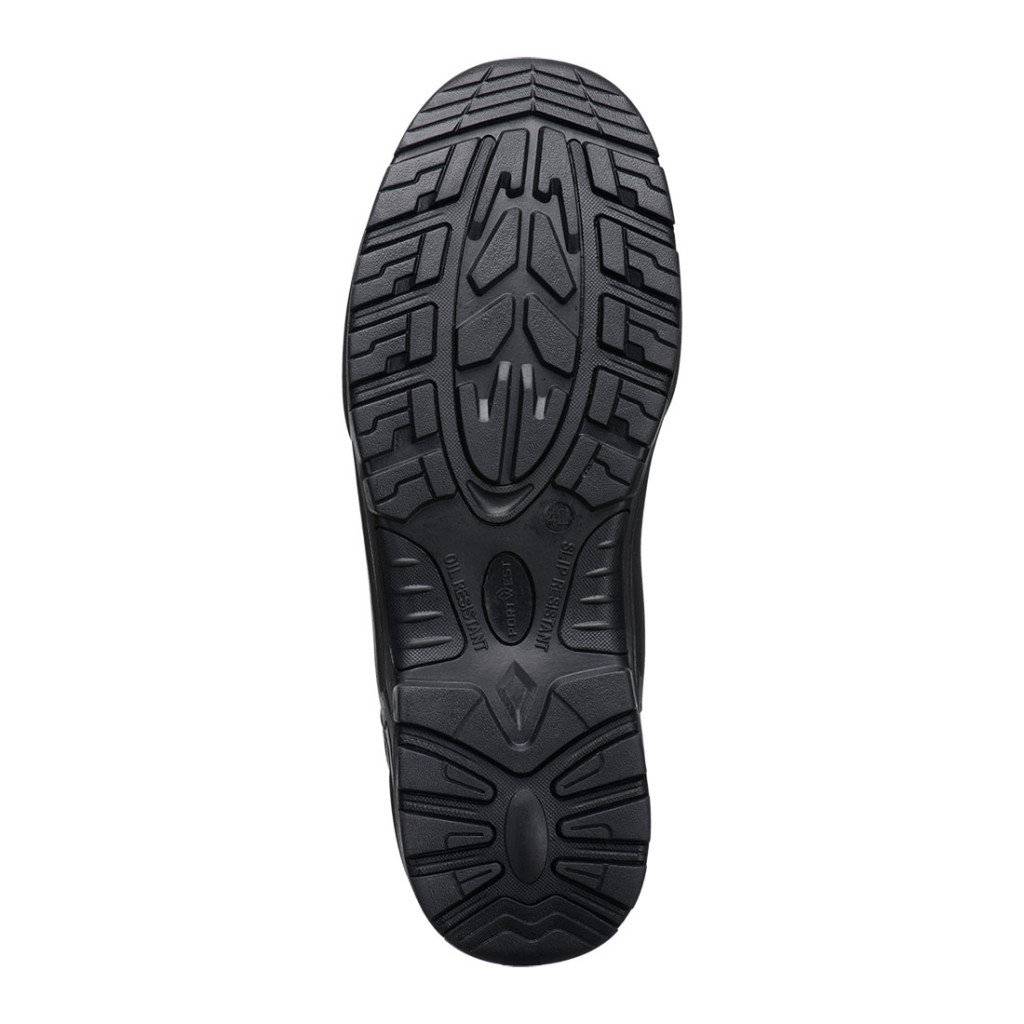 Védő acél lábfejjel, talpátszúrás elleni acél talplemezzel, hőálló külső talppal (300°C), strapabíró orrborítással, energiaelnyelő sarokkal, PU/gumi, csúszásmentes talppal és CE minősítéssel rendelkező antisztatikus munkavédelmi bakancs, amely olaj- és vízálló.