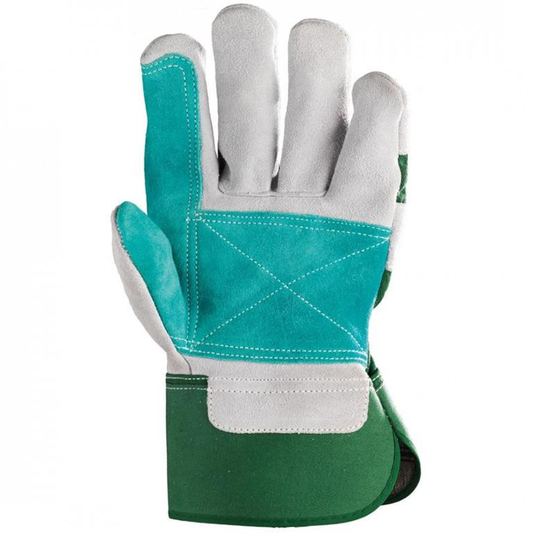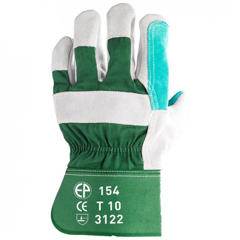 KÉT UJJON ERŐSÍTETT BŐRKESZTYŰ: • szürke marhahasíték tenyér • zöld marhahasíték megerősítés a mutató- és hüvelykujjon, valamint a tenyéren • erős, 300 g/m² vászon kézhát és mandzsetta • artéria-, köröm- és ökölcsontvédő • pamut tenyérbélés • MÉRET: 12-es extra nagy változat • CSOMAGOLÁS: 60/12 • EU szabvány: EN420, EN388: 3122