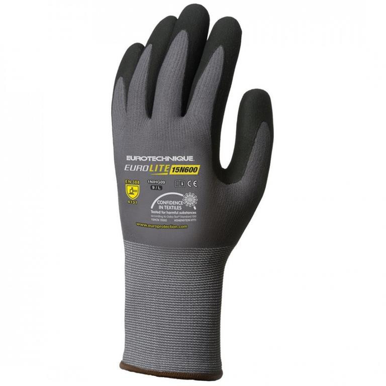 EUROLITE 15N600 FEKETE NITRIL MÁRTOTT KESZTYŰ: • 15-ös kötésű, erős szakítás- és kopásállóságú szürke nylon / spandex • tenyerén fekete szellőző mikrohabosított nitrillel mártott • szellőző kézhát, gumírozott mandzsetta • könnyű, kiemelten komfortos, teljesen kézre simuló formai kialakítás, tenyerén és a kézháton is biztosított szellőzéssel • Öko-Tex minősítés • széles méretszortiment • méret: 9-es • csomagolás: 100/10 – páranként külön csomagolva • EU szabvány: EN420, EN388:2003 4131