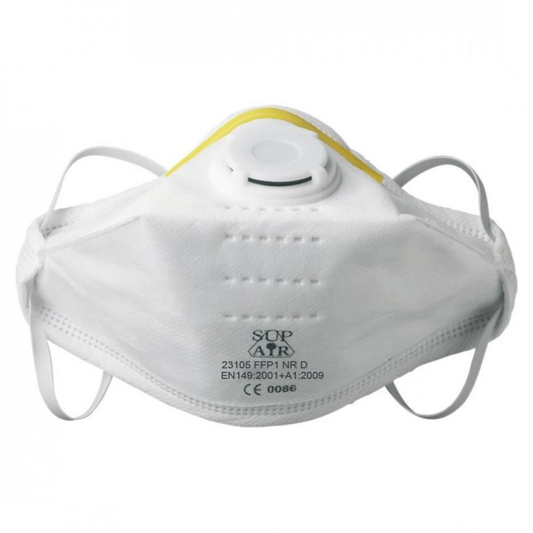 SUPAIR 23105 PANELES FFP1 NR D SZELEPES RÉSZECSKESZŰRŐ MASZK: • inert porok, valamint nem veszélyes szilárd és folyékony részecskék ellen (pl. cement, cellulóz, porcelán-kaolin, gumi, vasreszelék, szénpor, növényi olaj, liszt) • összehajtható paneles forma, higiénikus: minden darab külön tasakban; nem allergén • D: az EN149-es szabvány által meghatározott dolomit poros kiegészítő vizsgálaton is megfelelt, bizonyítva ezzel hosszabb élettartamát és jobb légzési komfortját • polietilénbe ágyazott, alaktartó fémszál orrcsipesz, kényelmes felfekvést segítő szivacscsík • külső és belső pp-SMS réteg, elektrosztatikus polipropilén közszűrő • felhelyezés két természetes gumipánttal • névleges védelmi tényező: 4 EH • 23105: kilégzést segítő szeleppel • SÚLY: 17 g • CSOMAGOLÁS: 240/20 • EU szabvány: EN149:2001 • A1:2009 • EU szabvány: EN149:2001 • A1:2009