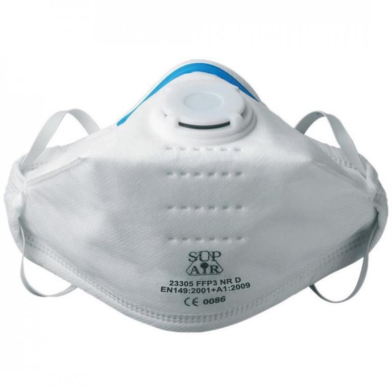 SUPAIR 23305 PANELES FFP3 NR D RÉSZECSKESZŰRŐ MASZK: • mérgek kategóriájába sorolt szilárd és folyékony részecskék ellen (pl. króm, mangán, nikkel, kadmium, platina, strichnin, enzimek, vírusok, gyógyszergyártás, elem- és akkumulátor feldolgozás) • összehajtható paneles forma, higiénikus: minden darab külön tasakban; nem allergén • D: az EN149-es szabvány által meghatározott dolomit poros kiegészítő vizsgálaton is megfelelt, bizonyítva ezzel hosszabb élettartamát és jobb légzési komfortját • polietilénbe ágyazott, alaktartó fémszál orrcsipesz, kényelmes felfekvést segítő szivacscsík • külső és belső pp-SMS réteg, elektrosztatikus polipropilén közszűrő • kilégzést segítő szelep • felhelyezés két természetes gumipánttal • névleges védelmi tényező: 50 EH • SÚLY: 19 g • CSOMAGOLÁS: 240/20 • EU szabvány: EN149:2001 • A1:2009