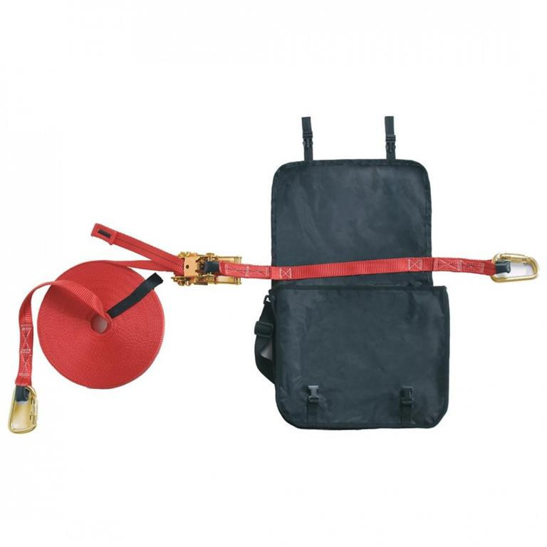 TOPLOCK 71750 EGYSZEMÉLYES VÍZSZINTES KIKÖTŐHEVEDER: • egyszemélyes, 3-15 m hosszú, állítható, vízszintes kikötőhevederzet • 19 m hosszú, 35 mm széles, piros munkaheveder és 0,7 m hosszú, 50 mm széles, fekete csatlakozó heveder rávarrott tartótáskával • racsnis, fém hossz- és feszességállító, műanyag fogantyúkkal • két acélkarabinere segítségével a kikötőheveder csak az EN795-ös szabványnak megfelelő, egy síkban elhelyezett fix kikötési pontokhoz rögzíthető, melyek minimális teherbírása 100kg esetén, 25 kN kell, hogy legyen • a megfelelő eséstér kialakításánál figyelembe kell venni a kikötőheveder – használati utasításban is feltüntetett – meghajlását, amely a kifeszített szalag hosszúságától és a munkavégzők számától függően 0,7 és 2,9 méter között változhat • kizárólag biztonsági teljes testhevederzettel (EN361) és független lezuhanásgátló rendszerrel együtt használható az EN354 és 355, illetve EN354 és 353-2 szabványokkal összhangban • EU szabvány: EN795 Class B