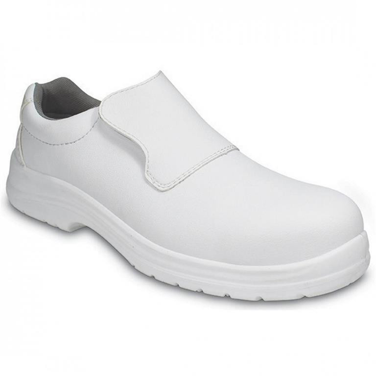 OKENITE (S2 SRC) BEBÚJÓS CIPŐ: Bebújós, szivacsos szártetővel • fehér, antisztatikus védőlábbeli, vízlepergető és szellőző mikroszálas felsőrésszel, kompozit orrmerevítővel • bevizsgált és nedves, tisztítószeres kerámia és acél felületre (SRC) minősített, csúszásbiztos, hajlékony, kétrétegű PU talp • nagy kopásállóságú, szénhidrátvegyületeknek, növényi olajoknak, állati zsíroknak, lúgoknak ellenálló, fehér talp • szivacsos lábfej, elasztikus komfortbetét • kék, kopásálló, nedvességszívó, antibakteriális, hálós szerkezetű, szellőző puha bélés, kényelmes talpbetét • méret: 36 • EU szabvány: EN ISO 20344, EN ISO 20345:2011