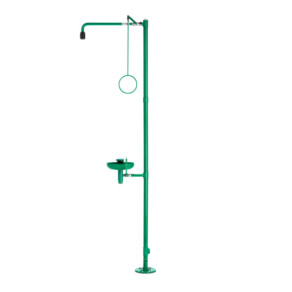 A szabadon álló ipari biztonsági zuhanyok minden olyan helyen használhatók, ahol a zuhany falra szerelése nem lehetséges, vagy ahol központi hozzáférési pontot kell létrehozni az elsősegélynyújtáshoz. Nagy ipari csarnokokban és termelési létesítményekben is érdemes használni őket. Nagy előny, hogy a zuhanyzó minden oldalról jól látható. A szabadon álló vészhelyzeti zuhanyok opcionálisan a helyi körülményekhez igazíthatók, a kiegészítők széles választékával. Nagy teljesítményű zuhanyfej a visszafogott, egyenletes és lágy vízsugárért a vegyszerek szemből történő kiöblítésére optimalizálva. A robusztus kialakítás alkalmas a mindennapi nehézipari használatra is. Tökéletes beállítást biztosít a vészhelyzeti testzuhany a helyszíni veszélyes helyzetekhez igazodva a percenként 50 és 110 liter közötti választható térfogatáramnak köszönhetően. Önleeresztő, nagymértékben vízkőmentes és karbantartásmentes, valamint nagyon tartós és korrózióálló. Az állítható vészhelyzeti testzuhanyok a helyszíni körülményekhez igazodnak. Vegyszerálló poliészter porbevonat az agresszív környezetben való használatra. Vízbemenet: 1 ¼”-es hüvelyes. Testzuhany áramlási sebessége: 75 l/perc | 20 GPM. Szemzuhany áramlási sebessége: 14 l/perc.